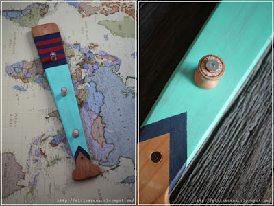 Пока красила, сообразила что у меня нет в наличии трех одинаковых крючков. Ехать в магазин совершенно не хотелось, и я приспособила старые деревянные катушки.