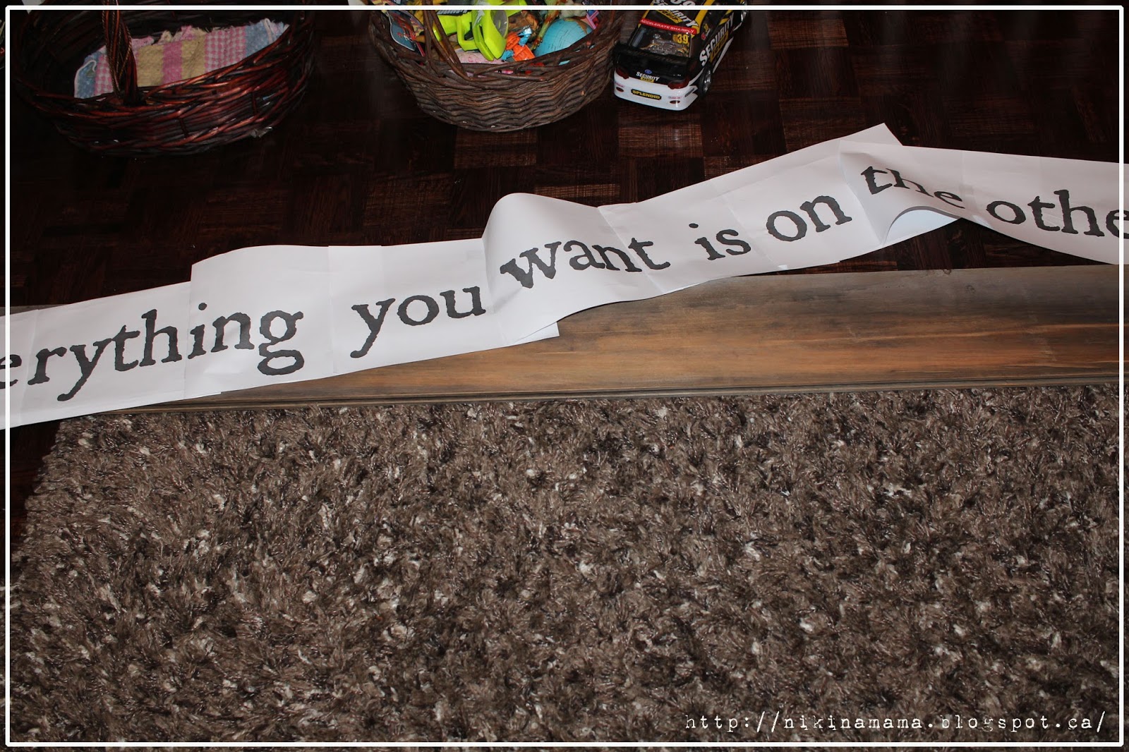 Я ее как увидела, так сразу представила висящей в комнате над карнизом. Оставалось ее отмыть (грязная была - просто ужас), высушить, выбрать какую-нибудь жизнеутверждающую фразу и впихнуть по всей длине доски. На поиски фразы ушло месяца три, и еще полгода на то, чтобы выбрать час времени и наконец-то ее повесить.Набила буковки в Ворде, нашла понравившийся шрифт, подогнала его по высоте доски, распечатала и склеила всю надпись вместе. Получилась такая длинная бумажная колбаса.